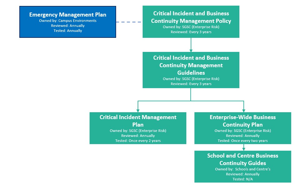 Enterprise Risk establishes and maintains the University’s Critical Incident and Business Continuity Management framework to provide a coordinated response to dealing with, and continuing business operations during a major or critical incident.