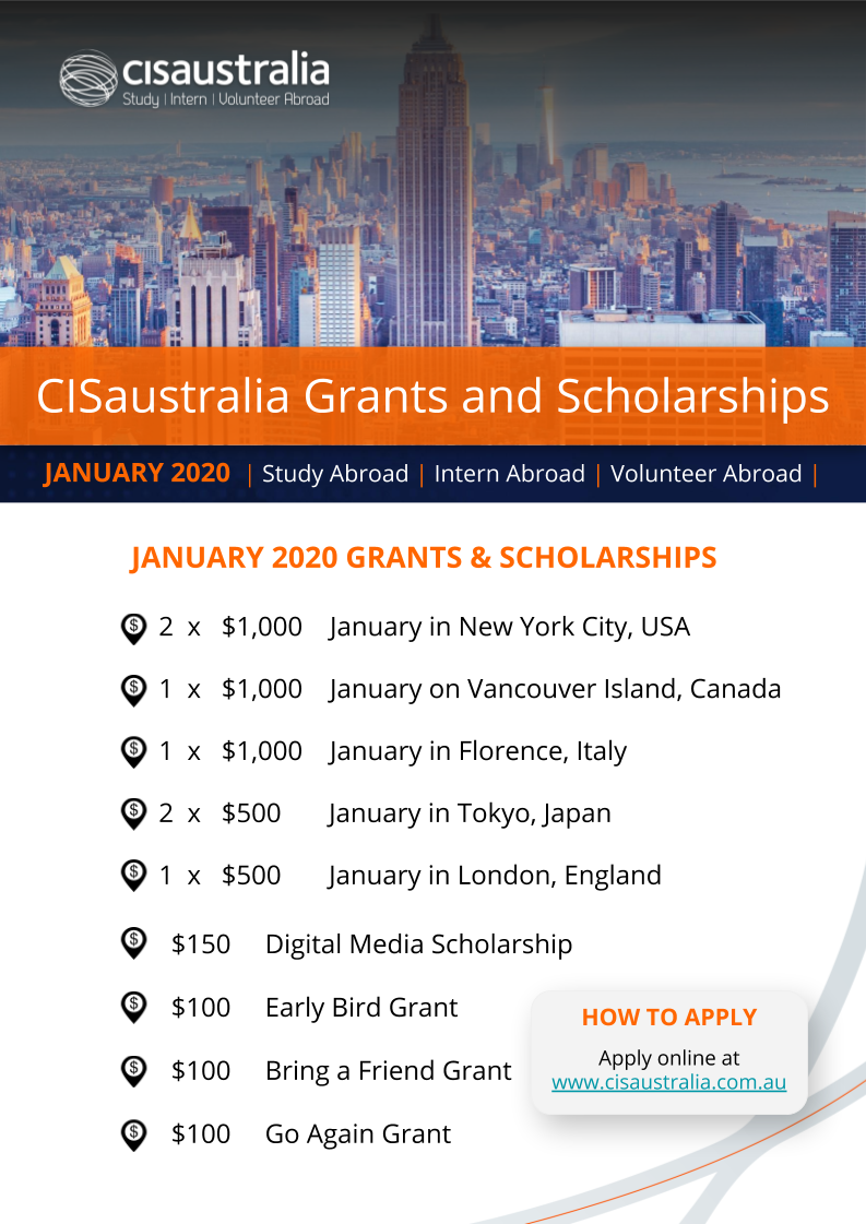 CISaustralia is dedicated to providing Australians innovative, high quality overseas study, intern and volunteer experiences while promoting global awareness, inspiring personal growth and developing engaged world citizens. They provide a number of grants and scholarships to support participation in CISaustralia programs. See here for those available.